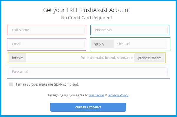 Langkah kedua adalah membuat akun di Pushassist dengan mengklik Sign Up. Setelah itu kamu akan dibawa kehalaman konfigurasi data seperti dibawah ini. Isilah form yang tersedia sesuai dengan data yang kamu inginkan. (sesuaikan dengan blog yang akan kamu pasang push notification). Ohiya, setelah kamu mengisi data form dengan benar, dan mengklik Create Account, Jika tidak ada perubahan yang terjadi pada layar, langsung saja cek email yang telah kamu daftarkan di Pushassist barusan. Buka pesan masuk dari Pushassist dan klik link verify . Kamu akan dibawa kehalaman baru dimana kamu akan login ke dashboard Pushassist, untuk membuat push notification di blogger.