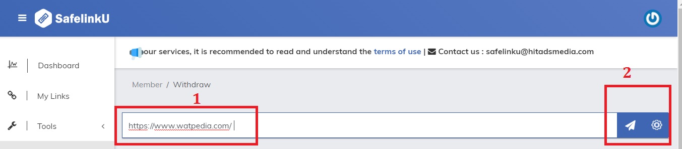 2. Setelah berhasil mendaftar. Tugas berikutnya adalah memasukkan link yang ingin kita hasilkan uang dengannya. Misal : kita punya link https://stag.watpedia.com/ lalu kita paste kedalam kolom yang tersedia. Lalu klik tanda kirim. Lihat gambar dibawah