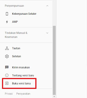 Langkah pertama yang harus kita lakukan jika ingin menghapus URL di GSC (Google Search Console) adalah masuk kedalam akun GSC yang kita miliki. Dan setelah masuk, pilihlah menu Buka Versi Lama. Lihat gambar dibawah ini.
