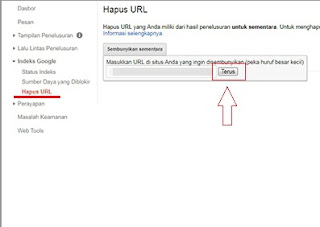 Langkah berikutnya adalah memasukkan URL yang ingin kita hapus dari Google Search Console. Isi kolom yang tersedia dengan URL yang akan kita hapus dari pencarian mbah Google, lalu klik tombol Terus. Lihat gambar dibawah kalau bingung. Jika masih bingung juga, terserahlah, saya juga bingung.. haha