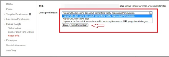 Langkah keempat yaitu memilih “Hapus URL dari Cache dan untuk sementara waktu hapus dari penelusuran”, kemudian klik tombol Kirim Permintaan. Lihat gambar dibawah lagi kalau bingung.